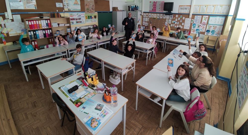Vestidos com fardas de agentes de segurança, cedidas pelo CDE da PSP, acompanhados por agentes e duas professoras, 23 alunos abordaram os condutores na via pública, nas imediações da escola.