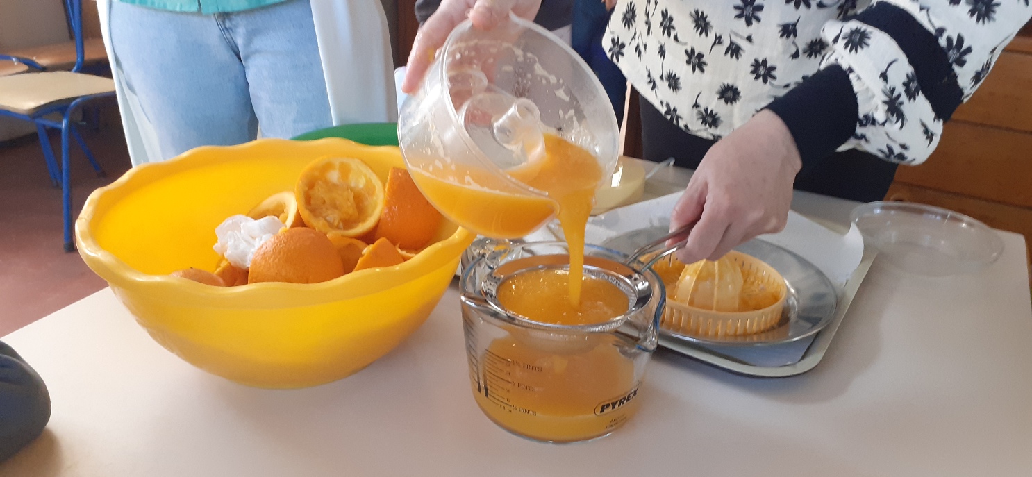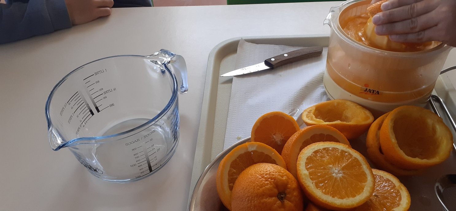 No passado dia 20 de março, a turma de 4.º ano da escola da Vista Alegre, com a sua professora Célia Ferro e com a professora estagiária Joana, levaram a cabo uma aula prática de Matemática para o estudo das Unidades de Capacidade. Para isso socorreram-se de dois recipientes graduados, de deliciosas laranjas e de dois espremedores de citrinos. Após espremerem todas as laranjas, verificaram a quantidade de sumo conseguido nos dois recipientes e fizeram ainda a conversão das quantidades obtidas nas Unidades de Capacidade – litro, decilitro, centilitro e mililitro. Foi uma atividade prática de aprendizagem muito divertida e muito saborosa.