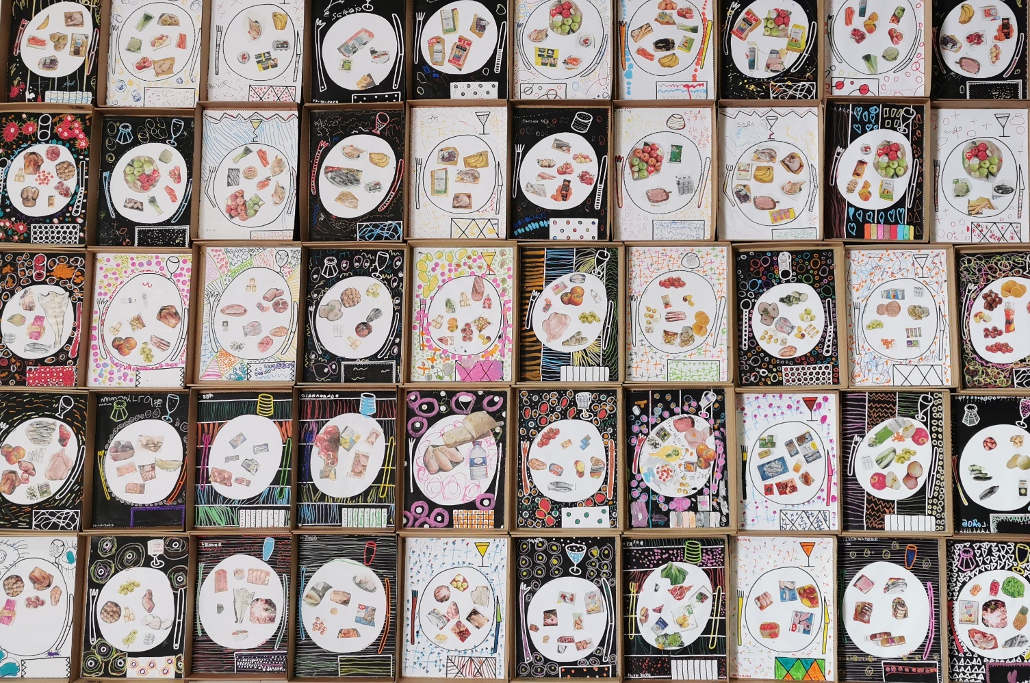 As crianças do jardim de infância MFP construíram um painel sobre alimentação saudável tendo como inspiração o livro do autor Hervé Tullet.