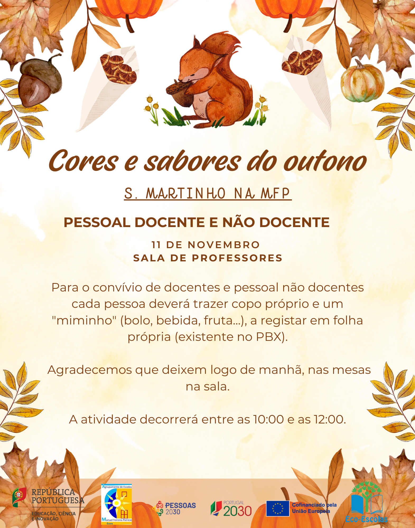 Os docentes deverão gerir o seu horário com a turma, fazendo o intervalo conforme acharem mais conveniente, de modo a participarem no Magusto, na sala de professores. Relativamente aos restantes elementos da comunidade escolar deverão também gerir o seu horário, conforme for mais vantajoso, de modo a participarem no convívio. Infelizmente sabemos ser difícil que os colegas das restantes escolas estejam presentes.