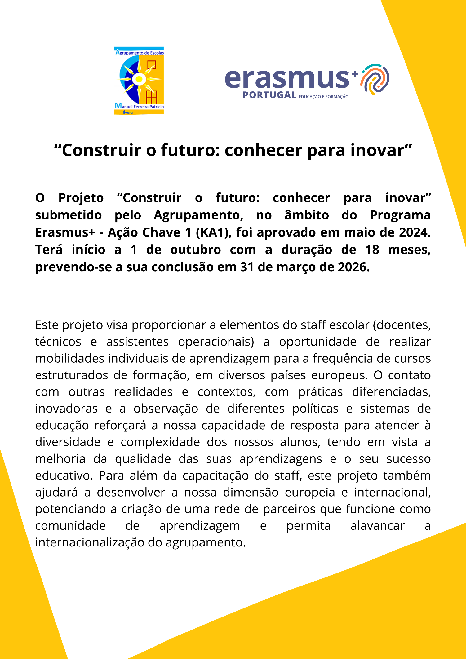distinguido com a Acreditação Erasmus+ no domínio do Ensino Escolar (KA120-SCH),